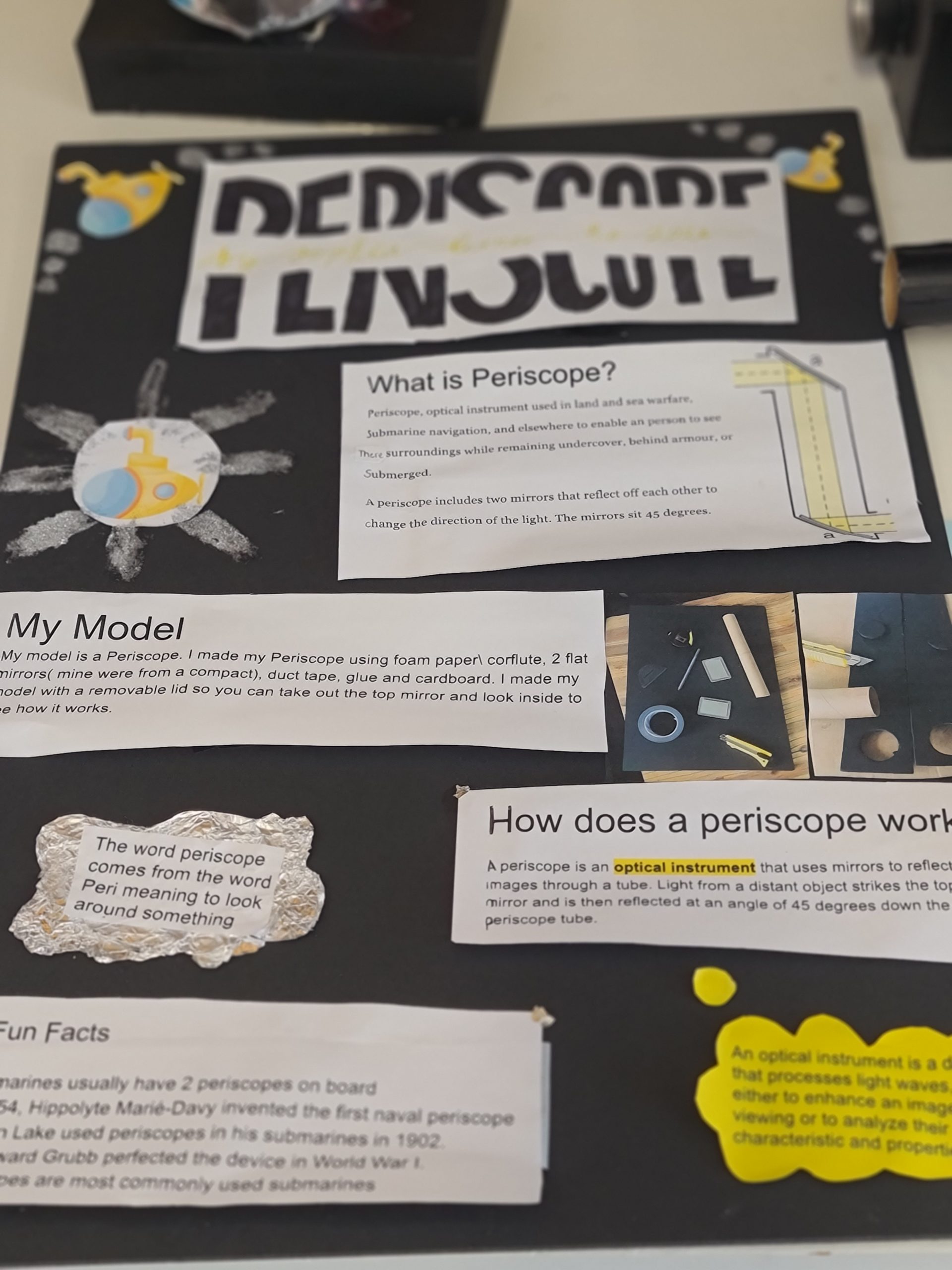 The Year 8 students have just finished their science unit on light. They looked at reflection and refraction, as well as the structure of the eye. For their end of topic project, students were asked to create a physical piece of work accompanied by a digital presentation, poster or video to demonstrate their learning from the unit. Many students were obviously inspired by the cow’s eye dissection, with a number of eye models being created over the holidays. There were also kaleidoscopes, pinhole cameras and periscopes. Included are a selection of photos of the finished projects. Mrs Stoddart was very pleased with the work the students put into their projects, they are amazing!