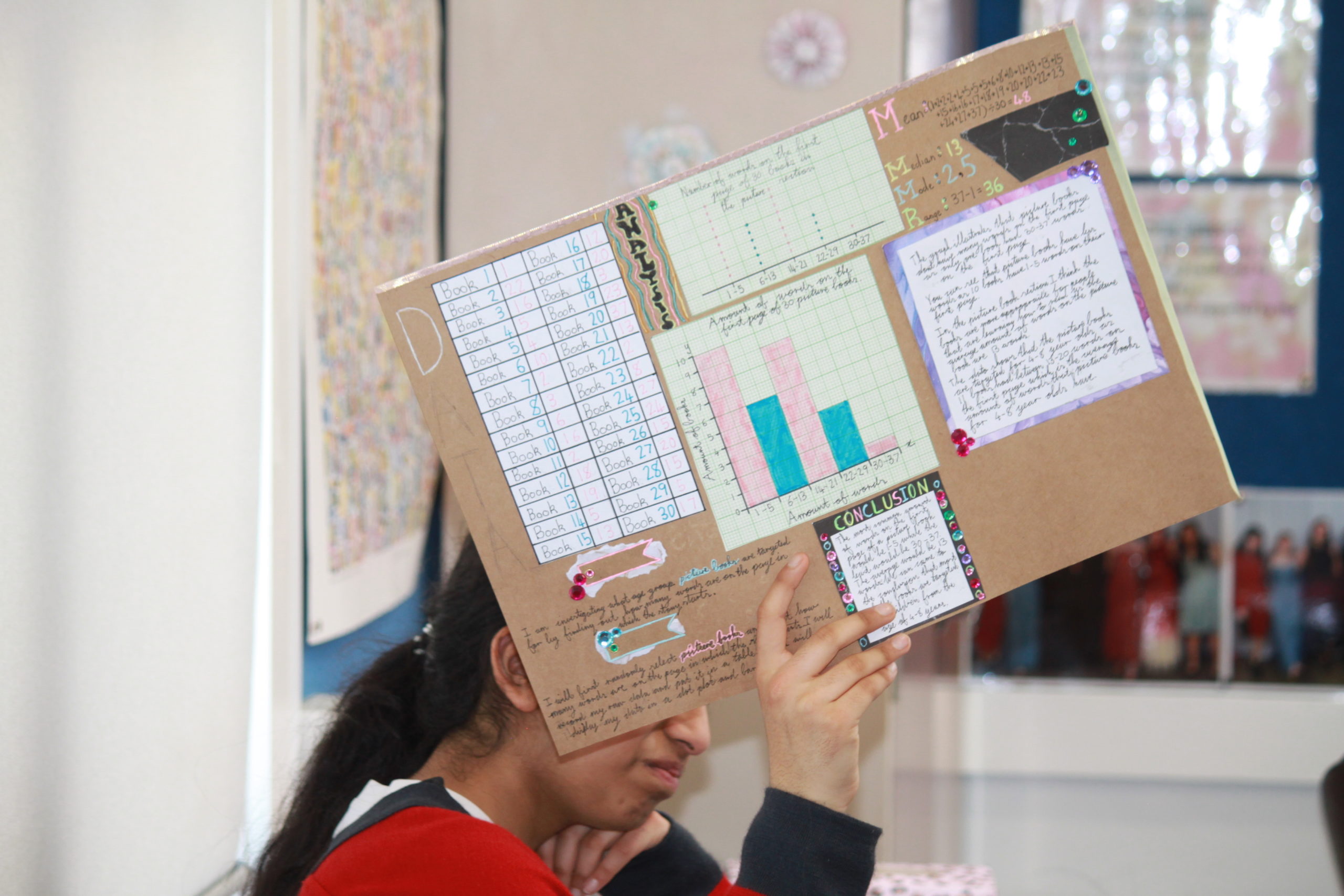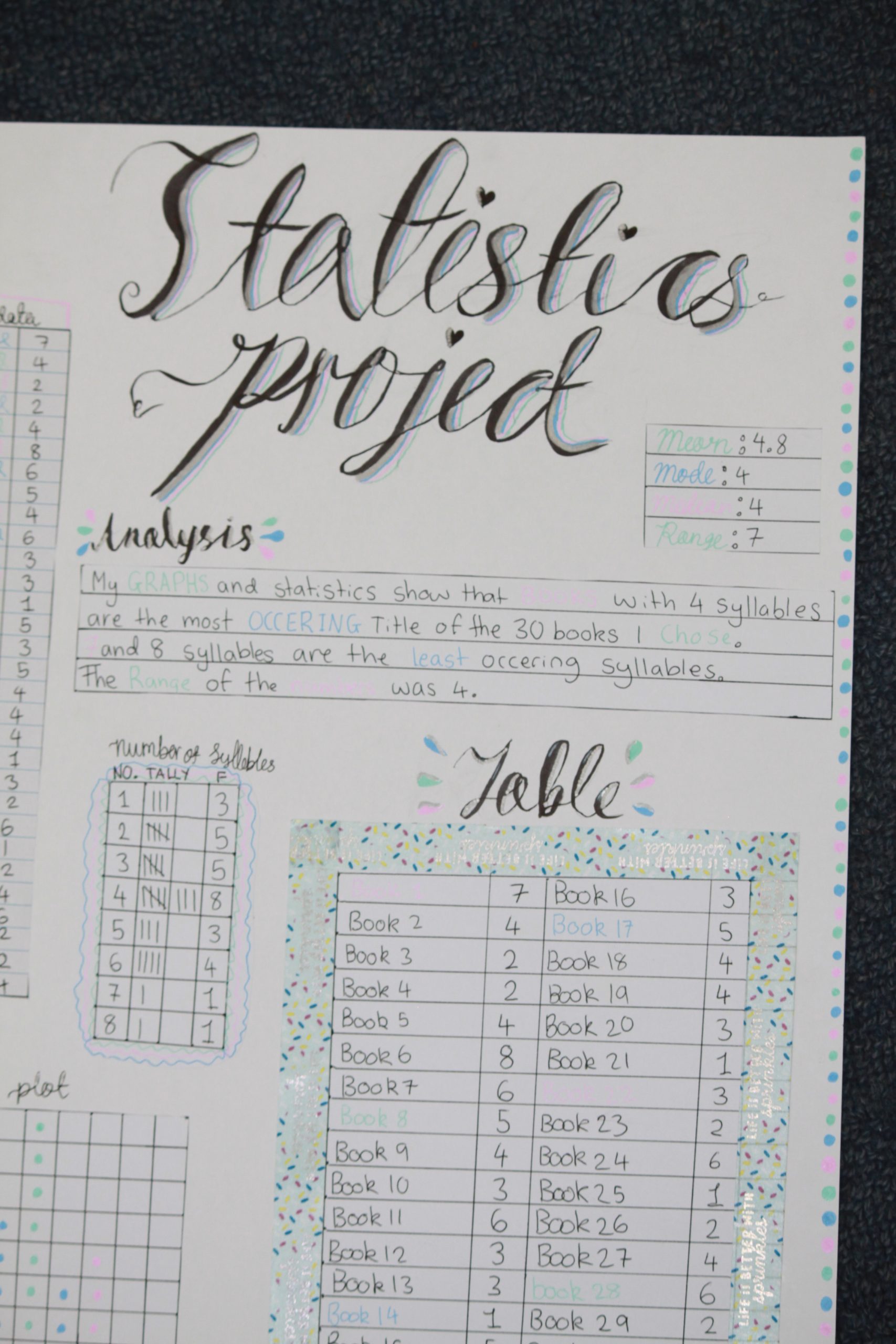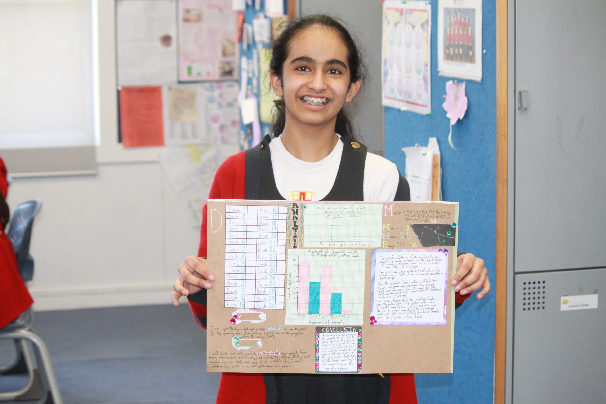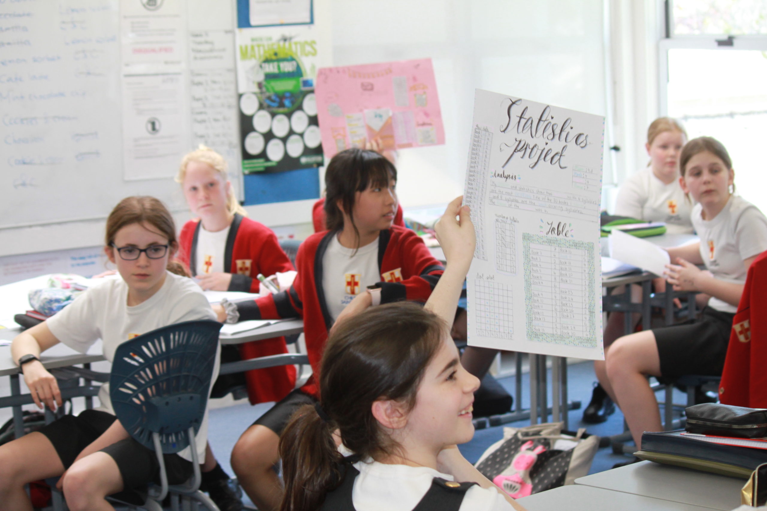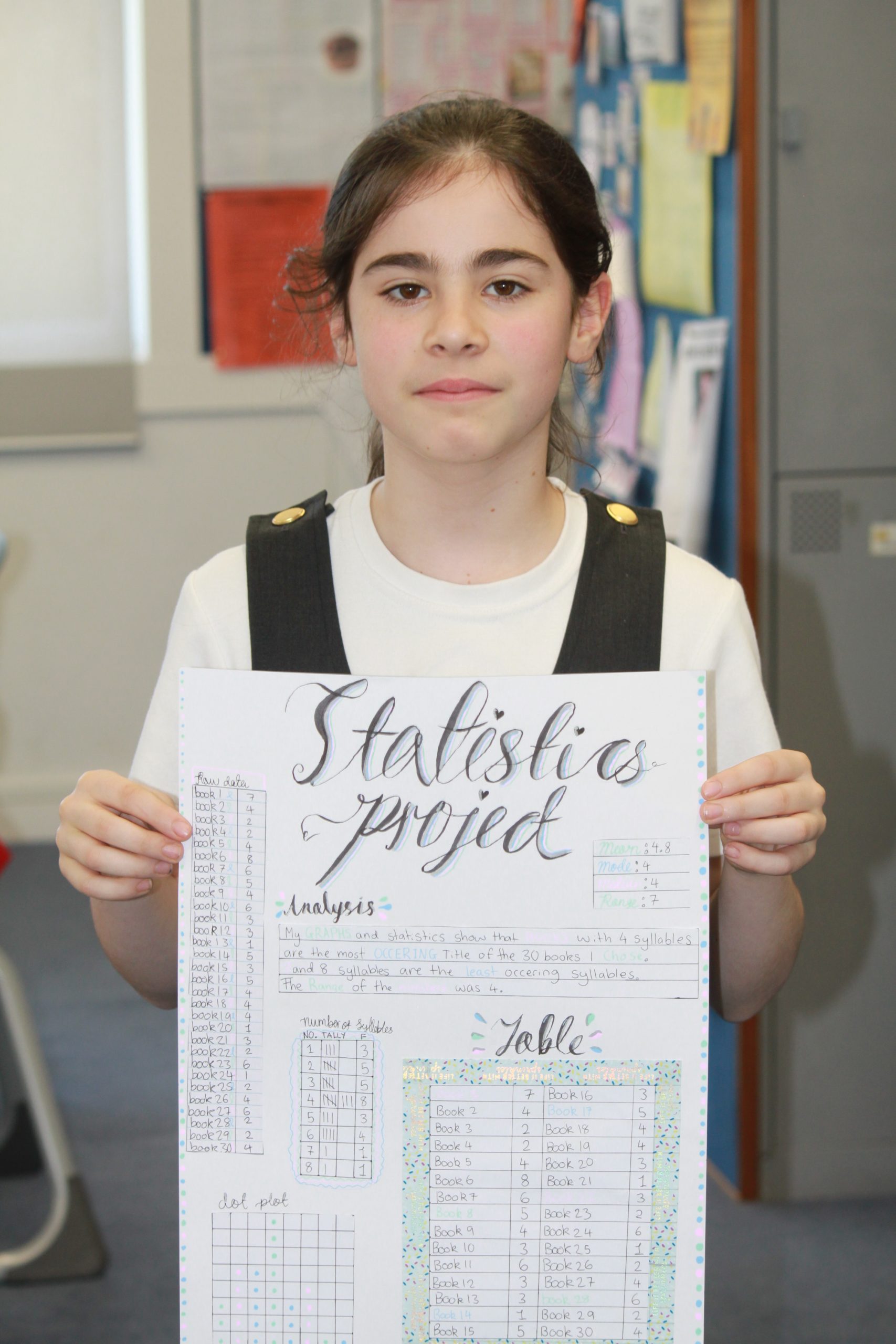 The lovely Year 7 classes have been very productive working on their Statistics project/assessment investigating the books in the library. Some of them involve looking at the number of vowels in a title, the number of chapters in a book and the number of words in the first sentence of a book. I’m immensely proud of their enthusiasm and effort! They have demonstrated a range of skills such as planning, drawing accurate graphs, analysing data and then telling a story. Well done girls!