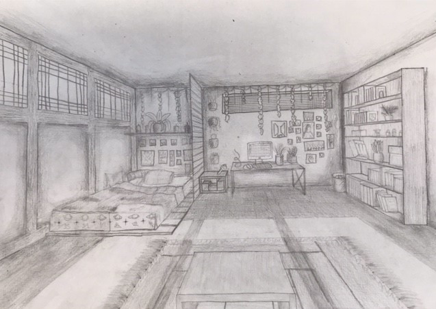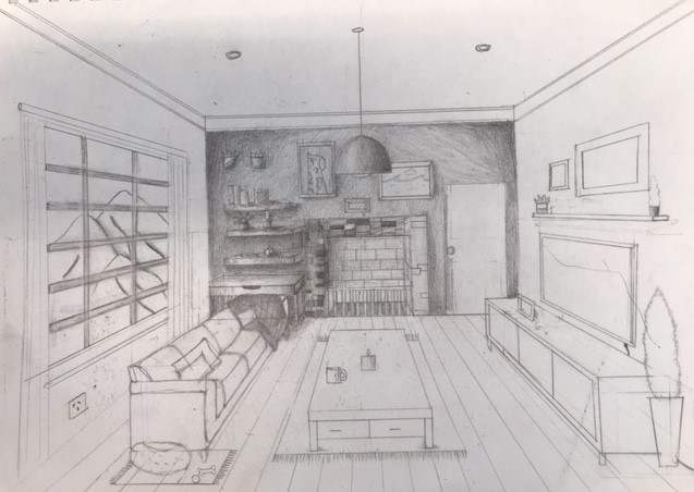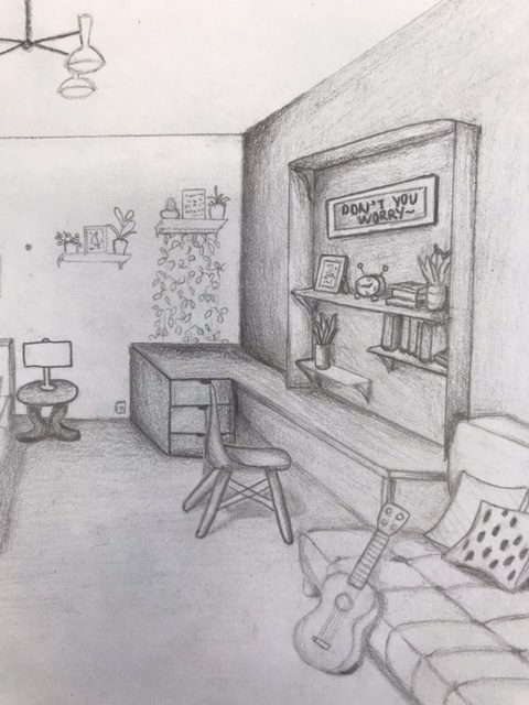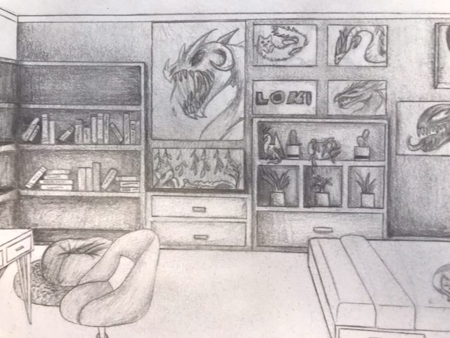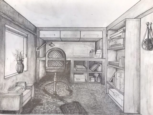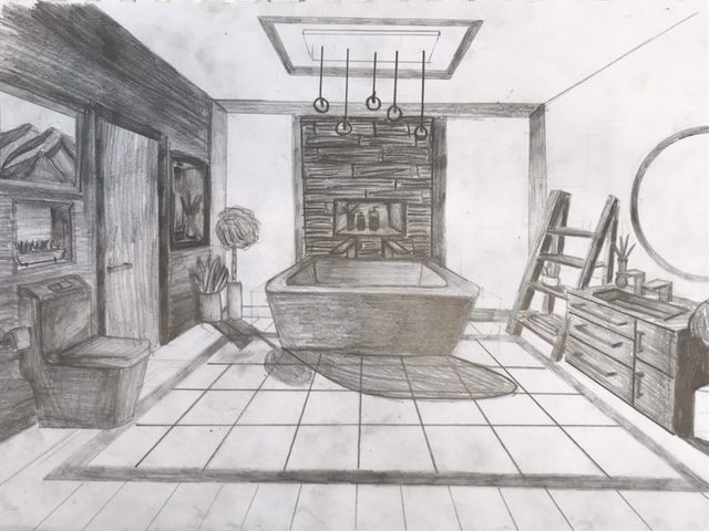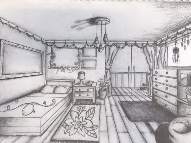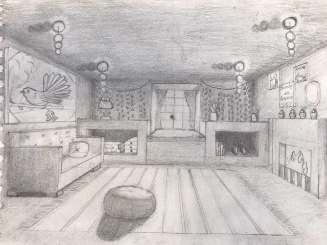 The Year 8 classes have been looking at the use of ‘One Point Perspective’ within their work. This began with the beautiful desert scenes which were completed earlier in the year depicting levitating boxes. These images using an interior scene has stretched the students skills and made them consider a much greater degree of detail when applying the rules of one point perspective. Students could depict any interior scene that they wished. The students chose to show bedrooms, bathrooms, kitchens, even prison cells and also some very creative surreal interiors.