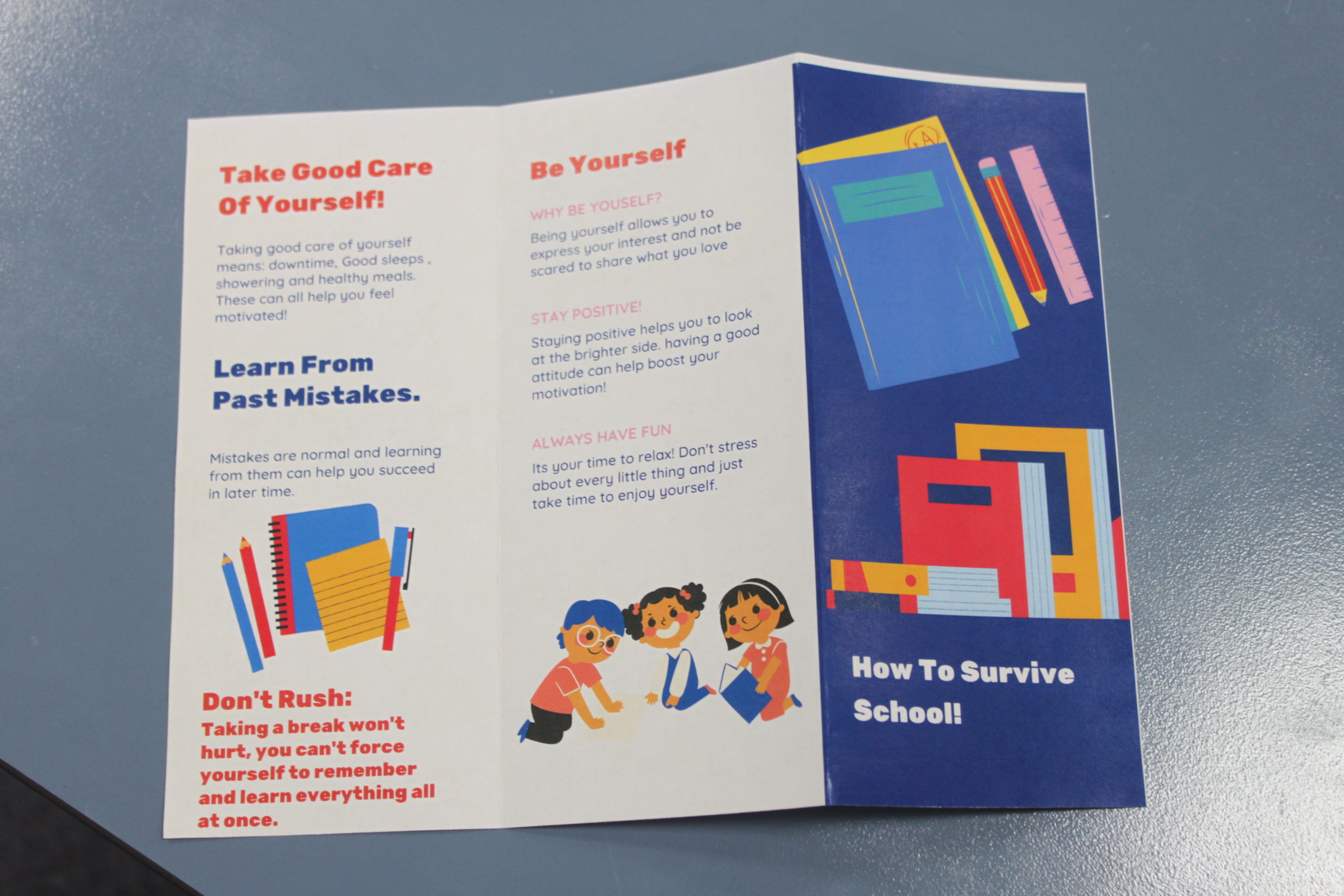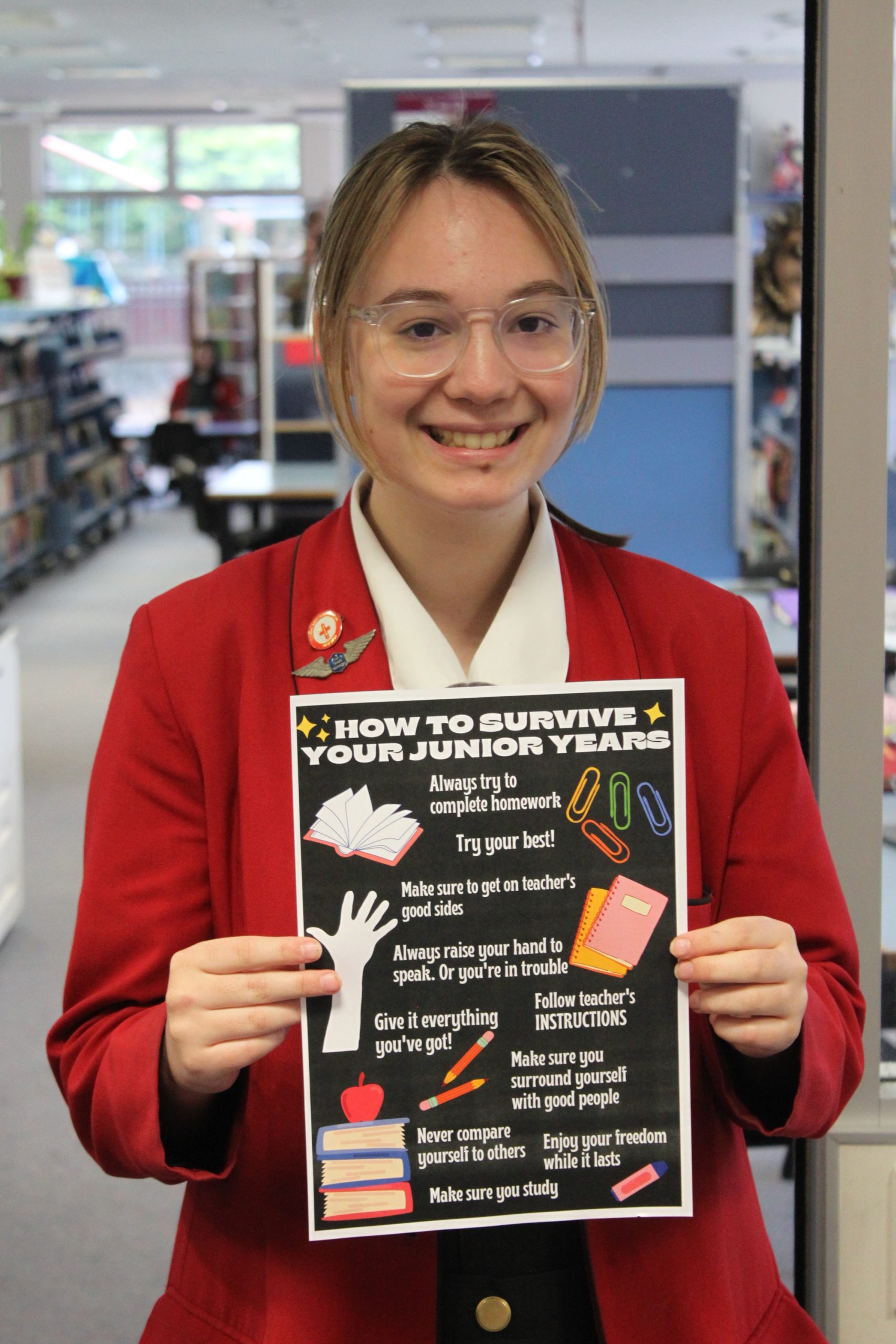 Our year 10 class had the privilege of producing a guide on how to survive junior years (7-9) This was a very entertaining experience for us, which made us all reflect on our past struggles, and what advice we would give to our former selves.